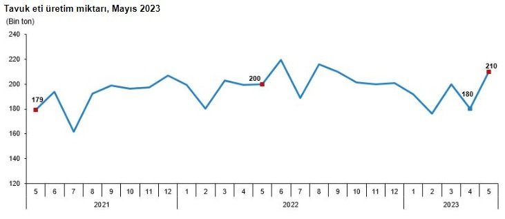 Bir önceki ay 180 bin 495 ton olan tavuk eti üretimi mayıs ayında yüzde 16,4 artarak 210 bin 14 ton oldu.