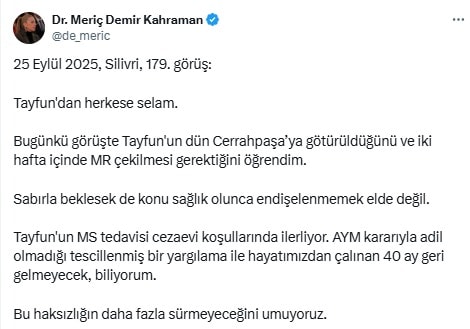 "Tayfun'dan herkese selam. Bugünkü görüşte Tayfun'un dün Cerrahpaşa’ya götürüldüğünü ve iki hafta içinde MR çekilmesi gerektiğini öğrendim.