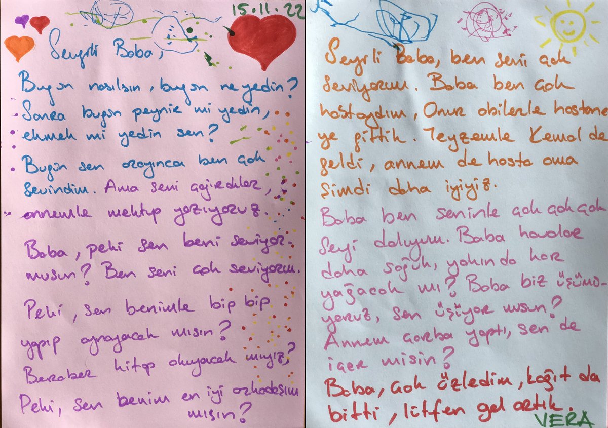 Tayfun Kahraman’ın eşi Meriç Demir Kahraman, küçük kızı Vera’nın babasına yazdığı mektubu sosyal medya hesabından paylaştı. Meriç Demir Kahraman, paylaşımında, "Bugün haftada 1 kez olan 10 dakikalık telefon görüşmemiz vardı Tayfun Kahraman ile. Bu süre özlemi dindirmeye bile yetmiyor elbette, Vera dedi ki: Baba sana mektup yazacağız, söz! Vera söyledi, ben yazdım; işte yarın postalayacağımız mektup..." ifadeleriyle birlikte mektuba yer verdi.