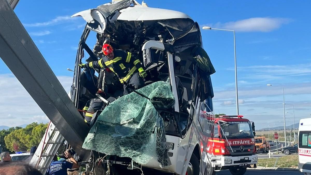 Kazanın etkisi ile kontrolden çıkan otobüs Karayolları Müdürlüğü’ne ait yön tabelalarına çarparak durabildi. Tur otobüsünün levhanın üzerinde askıda kaldığı görüldü.