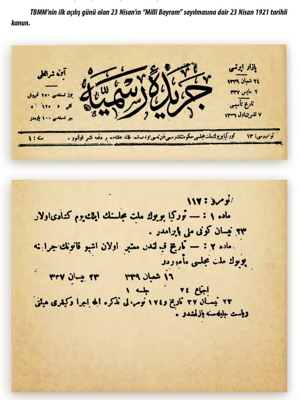 23 Nisan'ın Milli Bayram Addine Dair Kanun, Birinci Büyük Millet Meclisi'nin açılışından bir yıl sonra, 23 Nisan 1921'de kabul edildi ve 2 Mayıs 1921'de yürürlüğe girdi.
