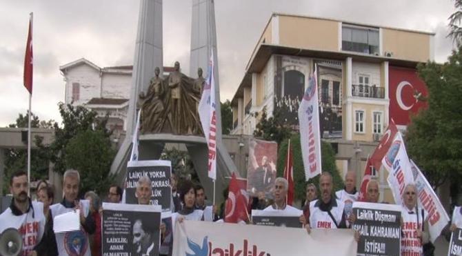 Ardından, Eğitim-İş 1 No'lu Şube Başkanı Ali Saraç basın açıklaması yaptı. Açıklamada, “Türkiye Büyük Millet Meclisi Başkanı İsmail Kahraman, laikliğin yeni anayasada olmaması ve dindar bir anayasa yapılması gerektiğini ifade ederek, AKP iktidarının hedefinin laikliği yok etmek olduğunu ikrar etmiştir. AKP sözcüsü gibi davranan İsmail Kahraman, laiklik ilkesine ve Cumhuriyet devrimlerine açıkça meydan okuyarak suç işlemiştir. Kahraman'ı kınıyor ve istifaya davet ediyoruz" denildi.