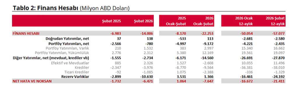 Öte yandan, doğrudan yatırımlarda 138 milyon dolarlık bir net çıkış yaşanırken, yurt dışı yerleşiklerin Türkiye'deki gayrimenkul alımları 230 milyon dolar seviyesinde sabit kaldı. Net hata noksan kalemindeki savaş öncesinde yaşanan 6,5 milyar dolarlık çıkış ise Şubat ayındaki finansman tablosunun en çok tartışılan kalemlerinden biri.
