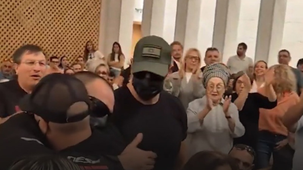 Sosyal medyada paylaşılan görüntülerde yüzlerini şapka, gözlük ve maskeyle gizleyen askerlerin birbirine sarıldığı, salondakilerin ise gülümseyerek onları alkışladığı görüldü.