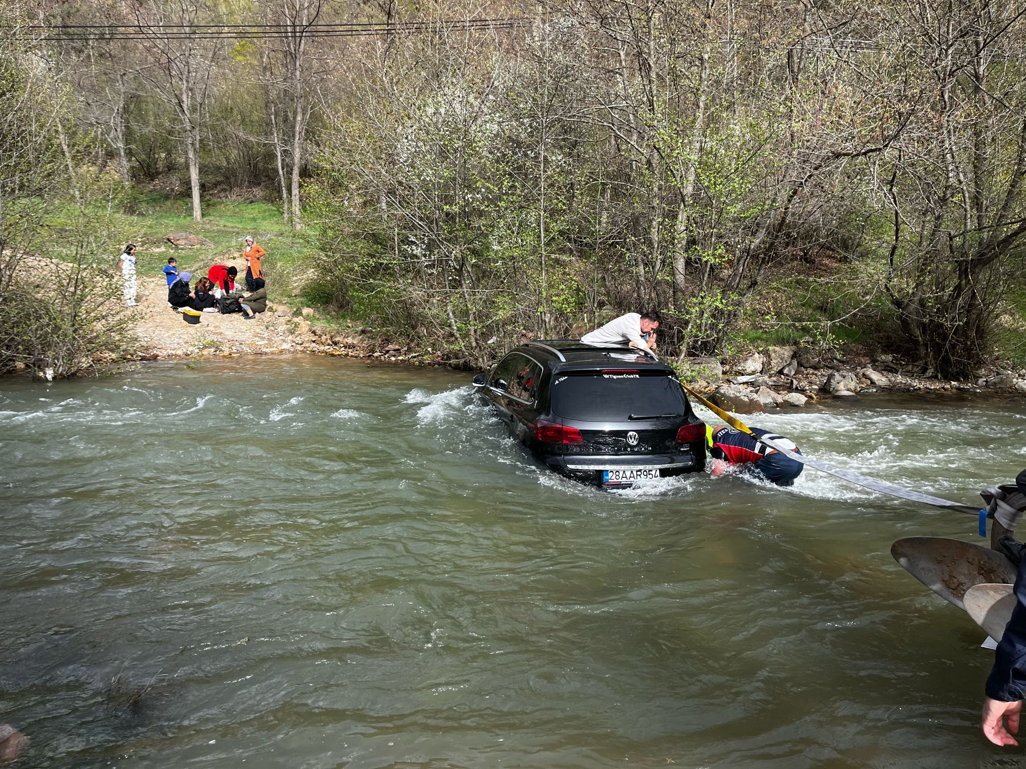 Lastiğin taşlara sıkışmasıyla içerisinde 4’ü çocuk 7 kişinin bulunduğu cip, suda sürüklenmeye başladı. Araçta mahsur kalanlar, kendi imkanlarıyla aracın tavanında bulunan ‘sunroof'tan çıkarak kurtuldu.