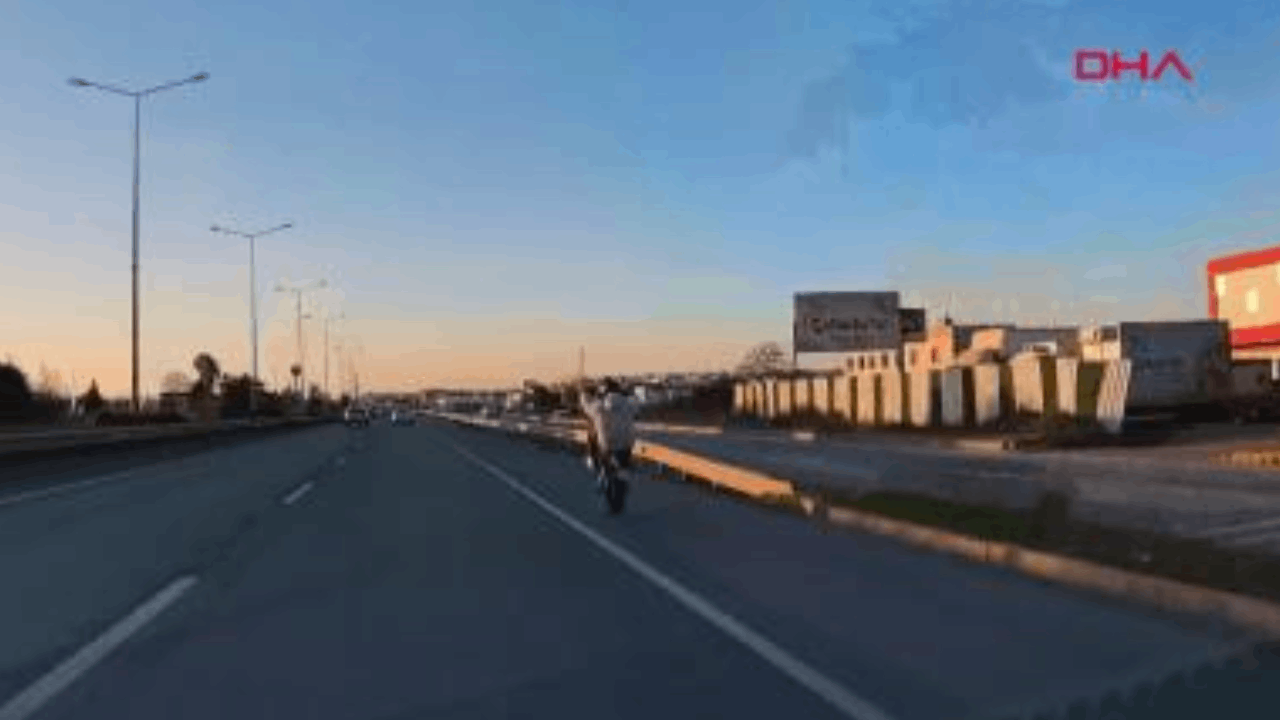 Sürücüsünün motosikletin ön tekerlerini kaldırdığı anlar bir iş yerinin güvenlik kamerası ve seyir halindeki otomobilin araç kamerasına yansıdı. Görüntülerde, motosiklet sürücüsünün hem kendisini hem de diğer sürücüleri tehlikeye attığı anlarda karayolunda yoğun ve hızlı bir trafik akışı olduğu görüldü.