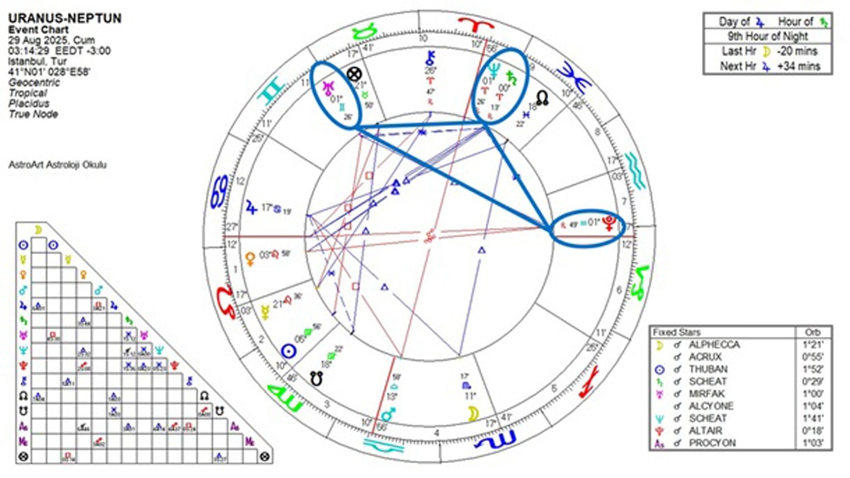 Güneş sistemimizin ağır hareket eden gezegenlerinden Uranüs ve Neptün arasındaki uyumlu açı hafta boyunca çok etkili olacak. Bu açı 29 Ağustos günü kesinleşiyor. Aşağıda bu ana yönelik astroloji haritasını ve ağır hareket eden, yani Güneş etrafında uzun yörünge çizen Satürn, Uranüs, Neptün ve Plüton arasında 60 ve 120 derecelik açılarla oluşan geometrik açı formunu görmektesiniz.