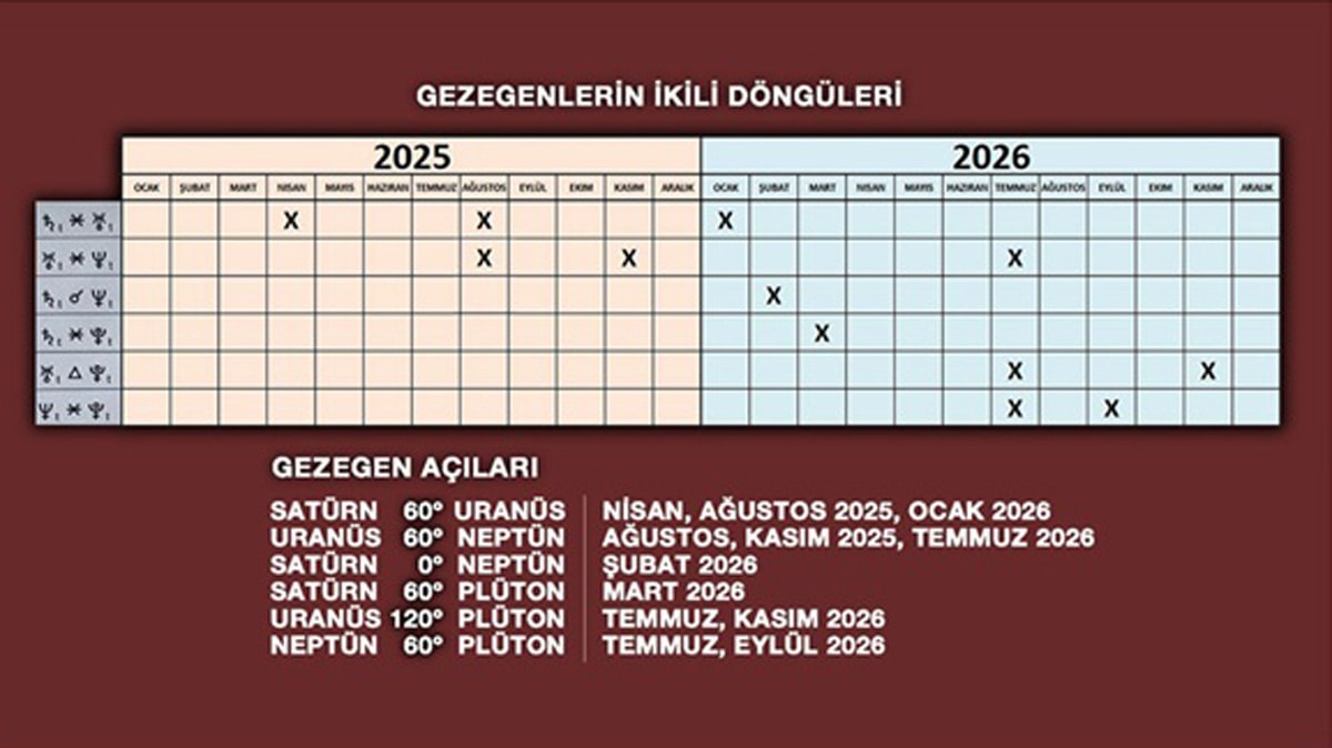 Dünya Astrolojisi branşında gerek sağlıklı öngörü yapabilmek gerekse içinden geçilen dönemi politik, jeopolitik, ekonomik, sosyal, kültürel, teknolojik açılardan daha iyi anlamak için gezegenlerin ikili ve üçlü döngülerini ve açısal bağlantılarını takip etmek çok önemlidir. Aynı Ay ve Güneş’in fazında olduğu gibi gezegenlerin ikili döngüleri vardır ve buna bazen üçüncü bir gezegen katılır. Bunlar bazen olumlu, bazen de olumsuz açılarla birbirlerine bağlanan gezegenler yoluyla olabilir. Ağır hareket eden gezegenlerin önemli açıları dünyevi olayların en vurgu kazandığı zamanlardır. Aşağıdaki tabloda gezegenlerin ikili döngü ve açılarının işaretlendiği tarihleri görmektesiniz. 2025 yılında başlayan bu ikili döngü ve olumlu açılar, 2026 yılında çok daha etkili olacak.