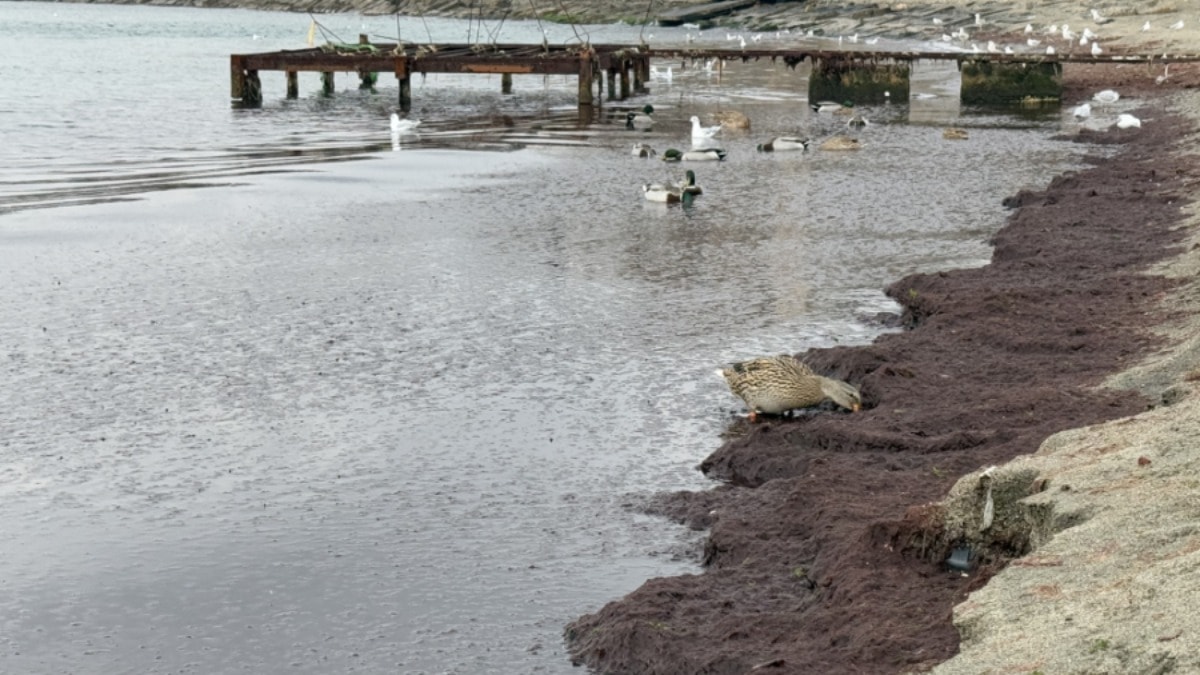 Sahildeki bazı alanlarda kırmızı yosun birikti.