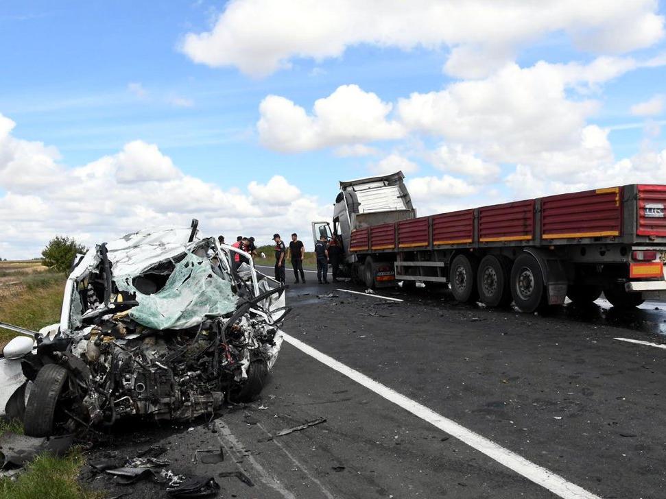 Orhan Köz'ün (43) kullandığı otomobil, karşı yönden gelen inşaat demiri yüklü Mecit Özdemir yönetimindeki TIR ile kafa kafaya çarpıştı.