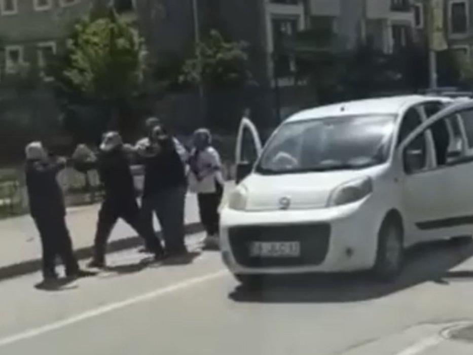 Sürücüler birbirlerine tekme ve tokat ile acımadan vururken kavgaya araçlarda bulunan aileler de katıldı. Ortalık adeta meydan muharebesine dönerken bu anlar cep telefon kamerasına yansıdı. (İHA)