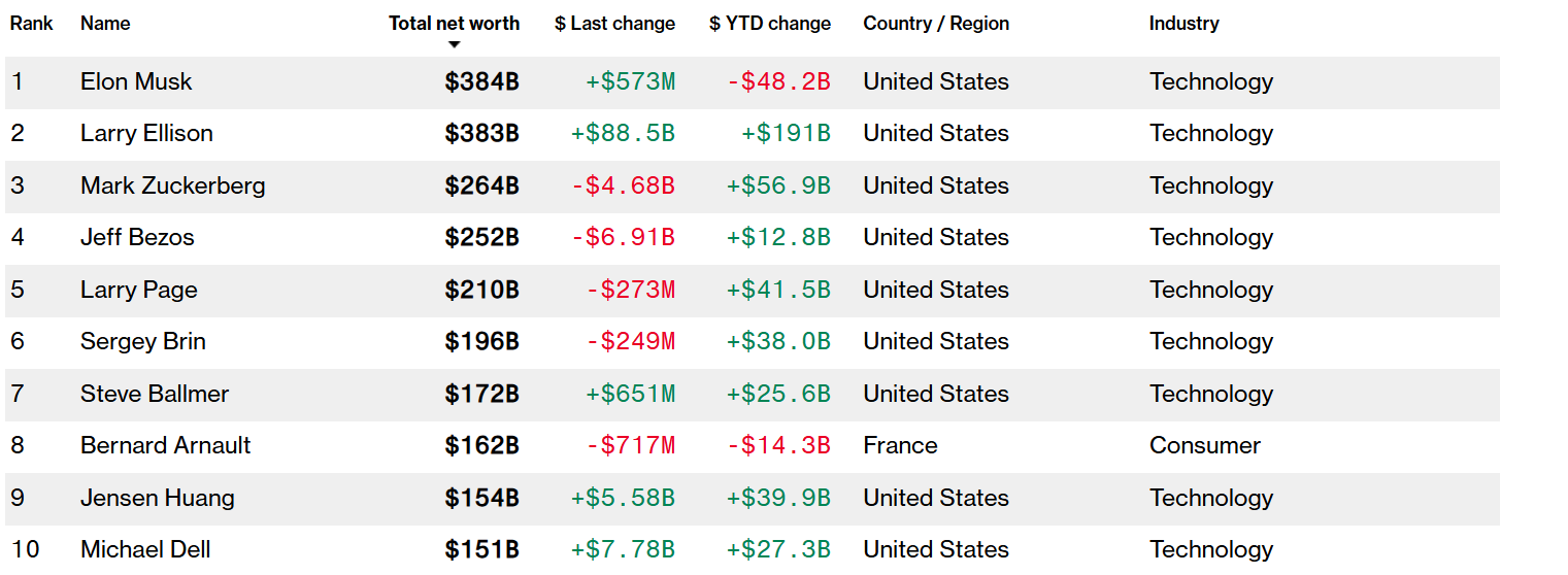 Oracle'nin sahibi Larry Ellison’ın servetinin bir günde 89 milyar dolar artması dünyanın en zenginleri listesinde birinci sıraya yükselmesini sağladı. Ancak Ellison kısa süreliğine dünyanın en zengin kişisi unvanını alırken lider yeniden Elon Musk oldu.