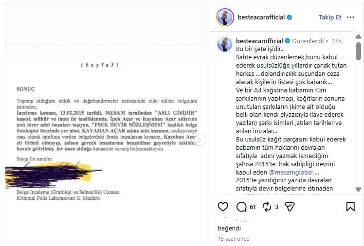İkiniz içinde suç duyurularım savcılıkta var. Babamın soyadı önce, arkasında şimdiki kocanın soyadını vagon vagon kullan şimdilik… Benim için yazdığın bu şarkının da benim olmasına az kaldı…SÖZ babacım... (Avukat Onur Yağışan'ı etiketleyerek) Son adımlar.BU SAHTE İMZALI A4 Kağıtların ASLI MESAM’da yoksa KİMDEYMİŞ???