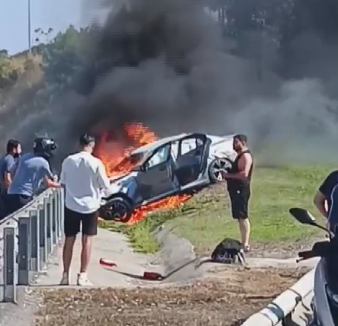 İstanbul Ümraniye’de TEM Otoyolu üzerinde sürücüsünün direksiyon hakimiyetini kaybetmesi sonucu yoldan çıkan otomobil, yol kenarındaki çim alana savruldu. Kaza sonrası aracın motor bölümünde yangın çıktı.