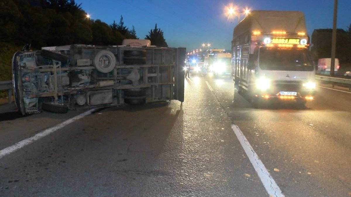 Ümraniye TEM Otoyolu'nda şoförünün direksiyon hakimiyetini kaybetmesi sonucu kontrolden çıkan kamyonet devrildi.