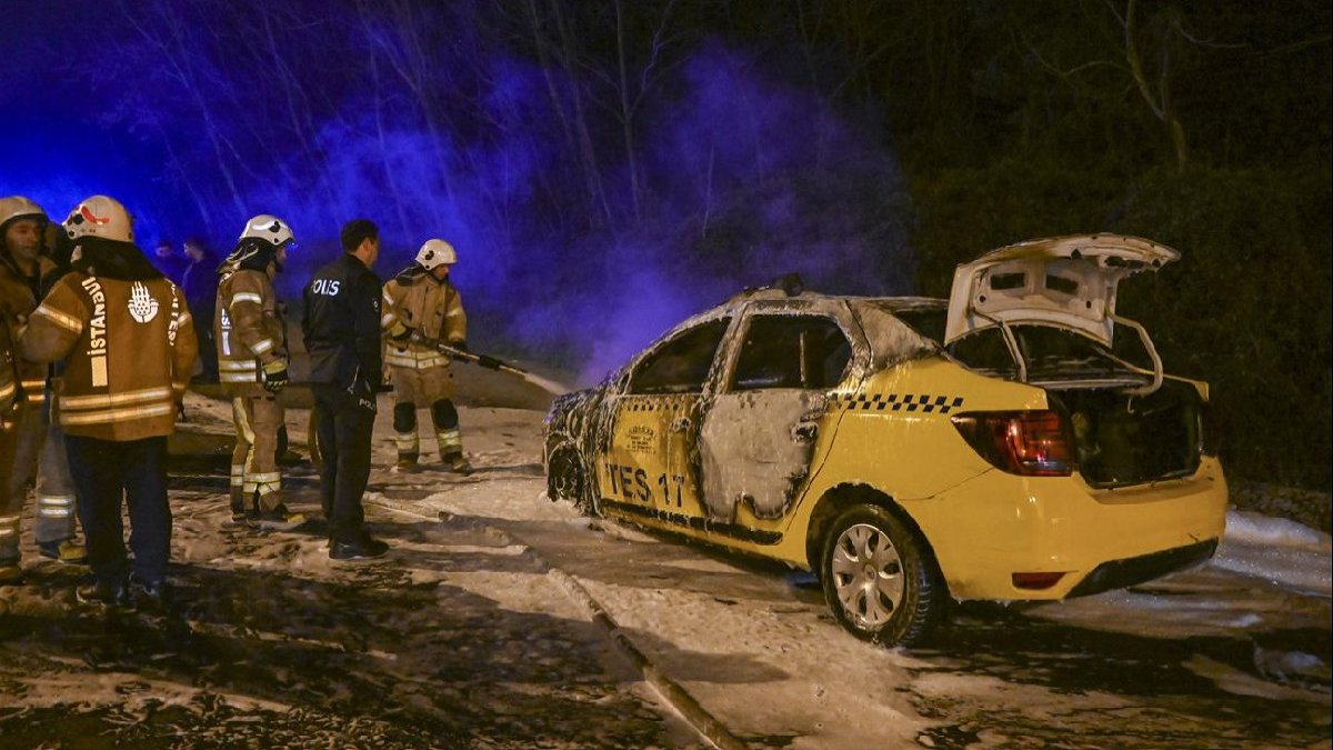Yangın itfaiye ekiplerince söndürülürken, takside hasar oluştu. (AA)