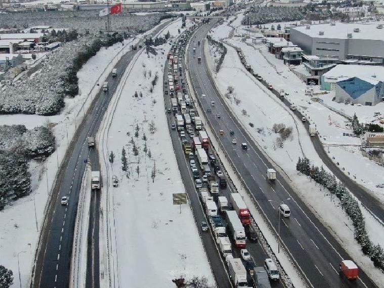 Etkili bir şekilde yağan kar vatandaşları mutlu etse ve enfes manzaralar oluştursa da hayata olumsuz etkileri de oldu. İstanbul’da sürücüler zor anlar yaşarken, yoğun kar yağışı nedeniyle İstanbul çıkışında Tem otoyolu Tuzla mevkiinde trafik kilitlendi. Kilometrelerce araç kuyruğu oluştu. Öte yandan uzun araç kuyruğu havadan görüntülendi. (İHA)