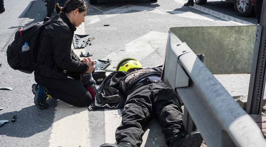 Foto: DHA -Kazada yaralanan motorsiklet sürücüsünü yoldan geçen diğer motorsiklet sürücüleri sakinleştirdi