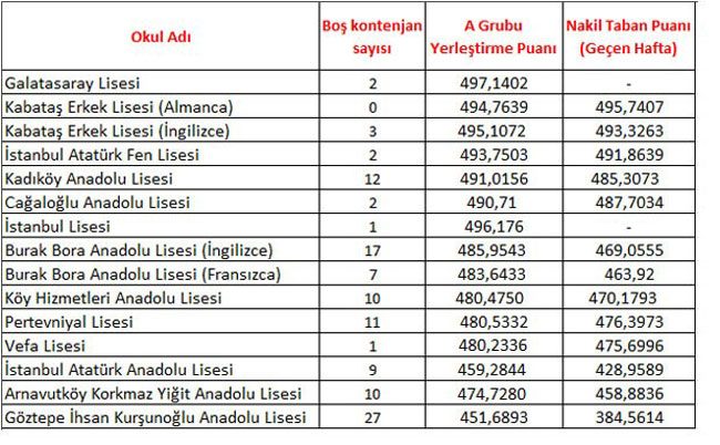 Ayrıca e-Okul’da liselerin hem A grubu yerleştirme puanları, hem de önceki hafta oluşan nakil taban puanlarına da yer verildi. Fakat Galatasaray ve İstanbul Lisesi’nin sadece A grubu yerleştirme puanları sistemde yer alırken, en son nakillerle oluşan taban puanları açıklanmadı.