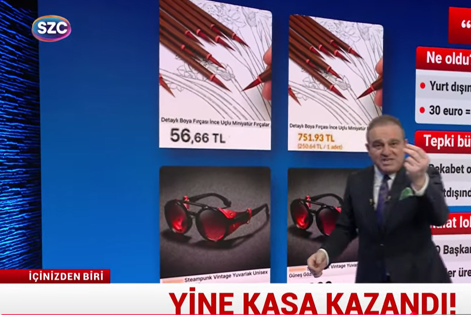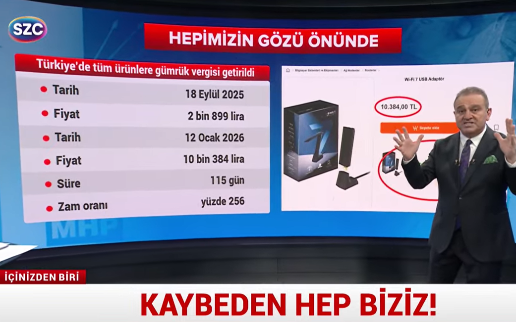 Açıkel, sözlerine; "Elif Akkaya editörümüz ile birlikte manşeti attık 'Kaybeden hep biziz'... Buyurunuz Wi-Fi kablosuz USB adaptörü. Bir 2 bin 900 liralık etiket var bir de 10 bin liranın üzerinde etiket var. Türkiye'de tüm ürünlere Gümrük Vergisi getirilmiş durumunda, gümrüksüz alışveriş bitti. 30 euro'nun üzerinde, farkındayım ama konuyu anlayalım." diye devam etti.
