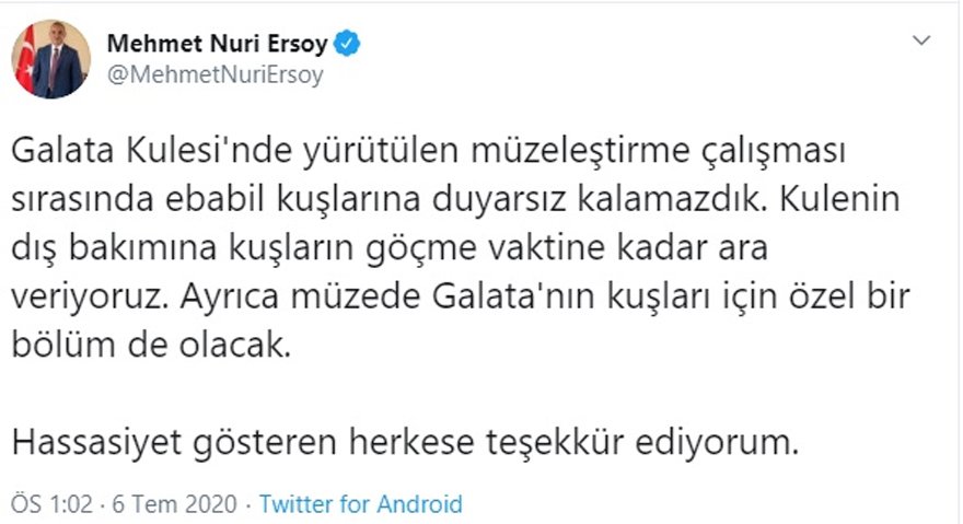 Sosyal medya hesabından açıklama yapan Ersoy, “Galata Kulesi'nde yürütülen müzeleştirme çalışması sırasında ebabil kuşlarına duyarsız kalamazdık. Kulenin dış bakımına kuşların göçme vaktine kadar ara veriyoruz. Ayrıca müzede Galata'nın kuşları için özel bir bölüm de olacak. Hassasiyet gösteren herkese teşekkür ediyorum” dedi.
