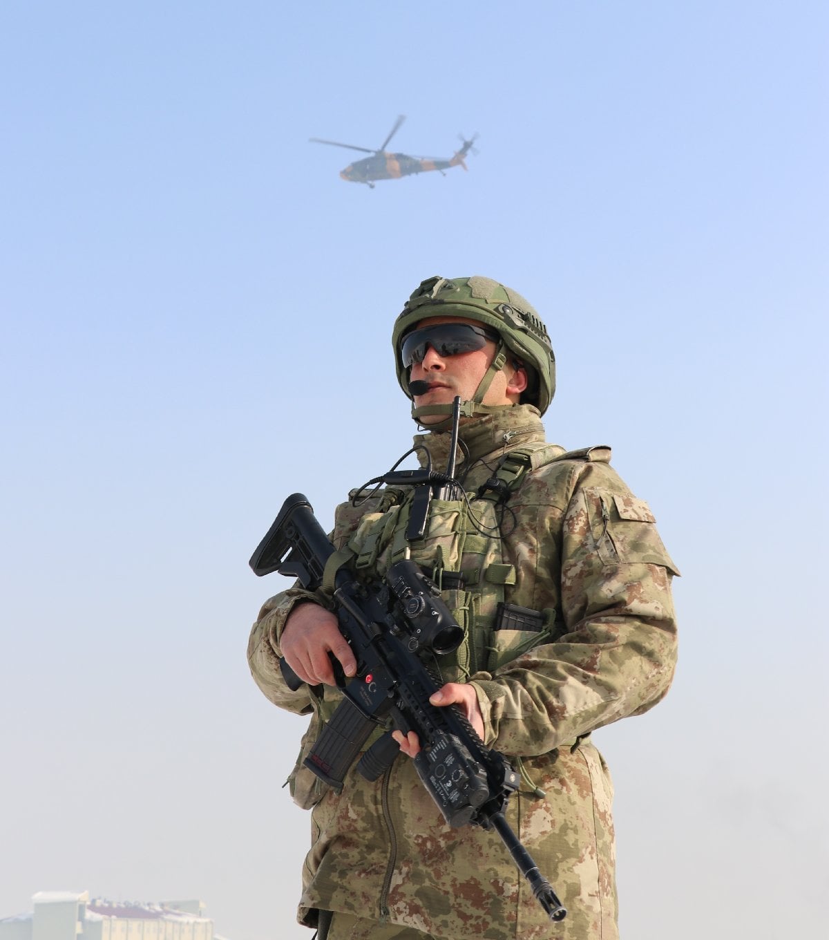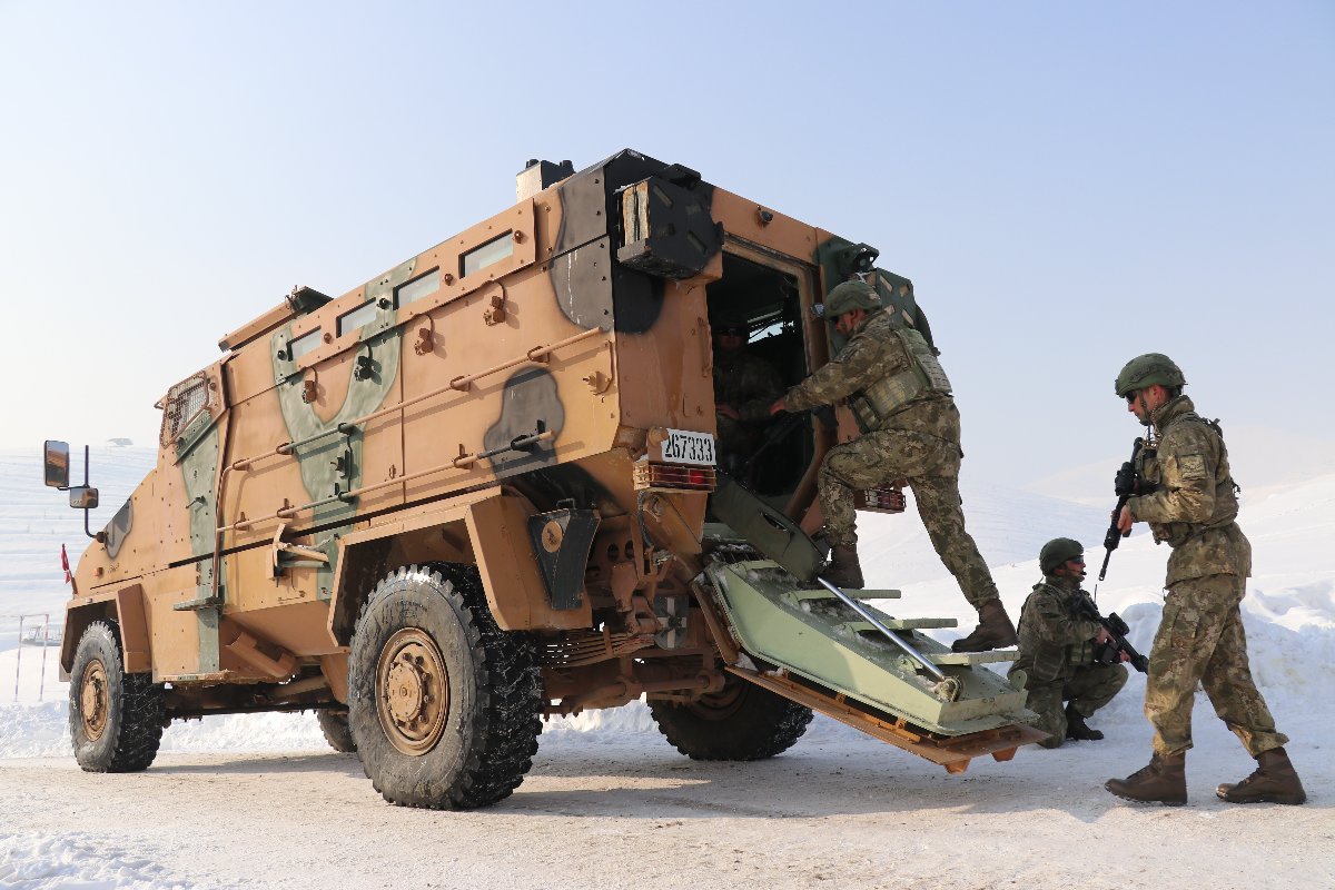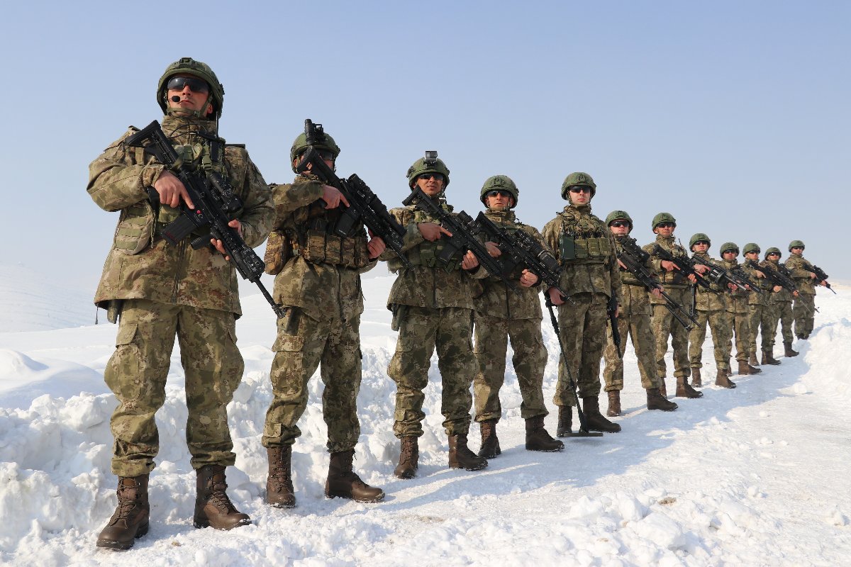 Yüksekova ilçesinde bulunan 3. Piyade Tümen Komutanlığında görevli askerler, kar kalınlığının yaklaşık 1,5 metreyi bulduğu arazide eksi 15 derecede yeni kamuflajlarını giyerek operasyonlarını kararlılıkla sürdürüyor. (İHA)