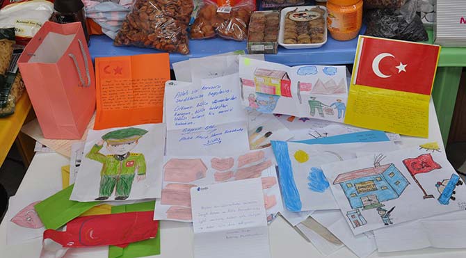 Toplanan malzemelerin kargoyla bölgeye gönderileceği öğrenilirken öğrencilerin ailelerinin yardımıyla asker ve polislere yazdığı mektuplar ise okuyanları duygulandırdı.. Öğrenciler, mektuplarında askerlere ve polislere duydukları sevgileri dile getirdiler. Öğrencilerden Beyazıt Bal, mektubunda 'Ülkemizi bütün düşmanlardan koruyun, bütün teröristleri öldürün, onların hiç mermisi kalmasın' ifadelerine yer verdi.