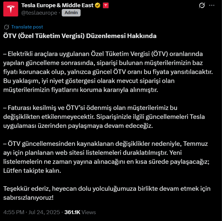 Tesla tarafından yapılan açıklamada, siparişi bulunan müşterilerin yalnızca güncel ÖTV oranından etkileneceği, bunun dışında fiyat değişikliğine gidilmeyeceği belirtildi.