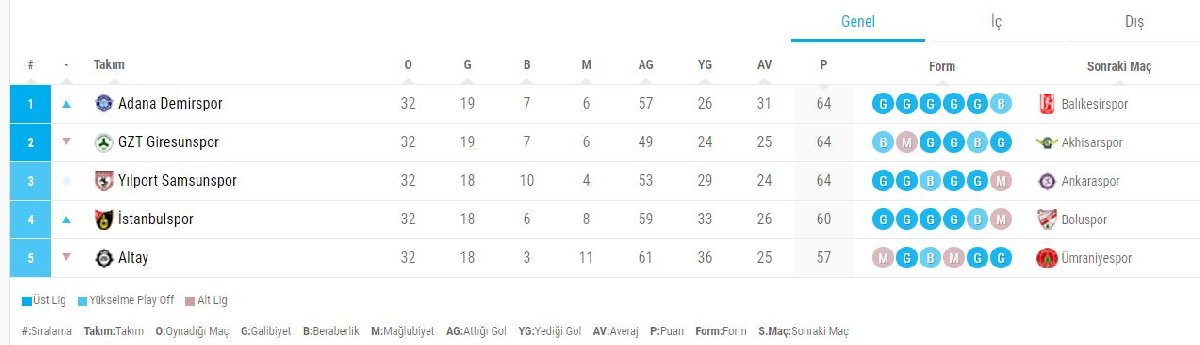 Tuzlaspor'u mağlup eden Adana Demirspor 32. hafta itibariyle 64 puanla ligin liderliğine yerleşti, Giresunspor ve Samsunspor ise aynı puan ve averajla sırasıyla 2. ve 3. sırada yer aldı.