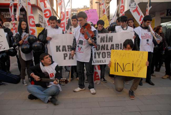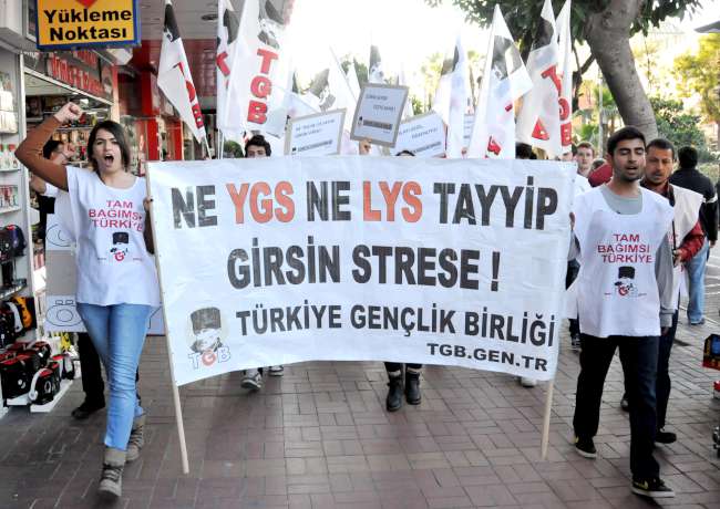 Antalya'nın Alanya İlçesi'nde, Türkiye Gençlik Birliği (TGB) üyesi bir grup, Yükseköğretime Geçiş Sınavı'nı (YGS) mini tiyatro oyunuyla protesto etti. Eylemciler daha sonra ellerindeki kalemleri kırarak, 'Ne YGS ne LYS, Tayyip girsin strese' sloganı attı.