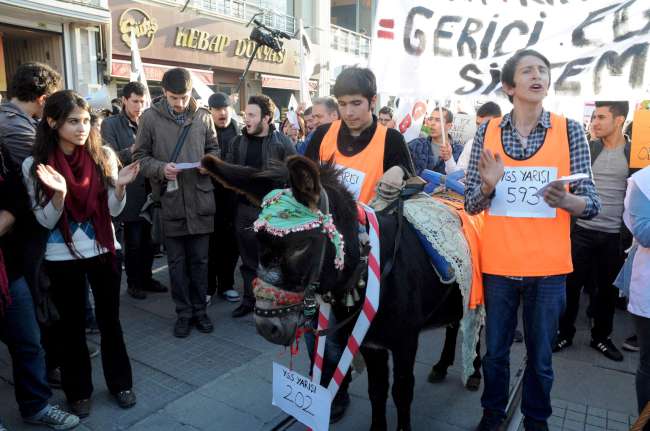 Galatasaray Lisesi önünde, saat 16.00 sıralarında toplanan çoğu lise öğrencisi yaklaşık yüz TGB'li, hep bir ağızdan, &lsquoAh bu hayat olmazsa' ve 'Arkadaşım eşek' şarkılarını kendilerine göre uyarlayarak söyledi. Eylemciler, yanlarında getirdikleri eşeğe ve kendi boyunlarına yarışı simgeleyen numaralar asarak, Taksim Meydanı'na yürüdü. "Bilimsel, laik, parasız eğitim" yazılı pankart açan TGB'liler, "Titre AKP Türk Gençliği Geliyor" "A,B,C,D,E Kopyacı, şifreci AKP", "Atatürk Gençliği görev başına" şeklinde sloganlar attı.