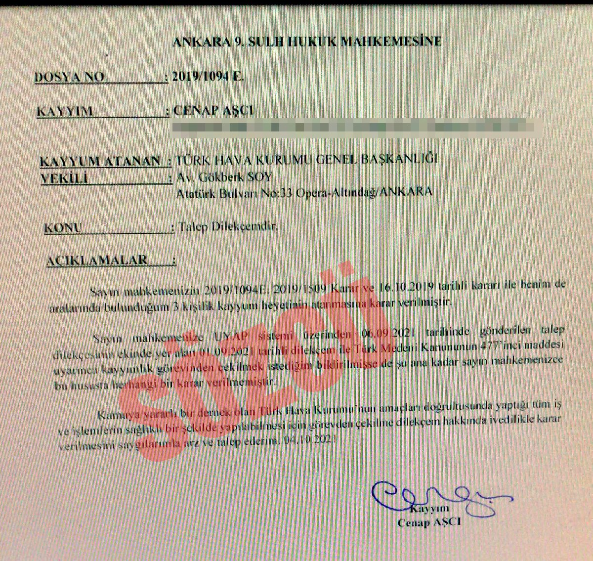 Cenap Aşçı'nın Ankara 9. Sulh Hukuk Mahkemesi'ne sunduğu ikinci dilekçe şöyle: