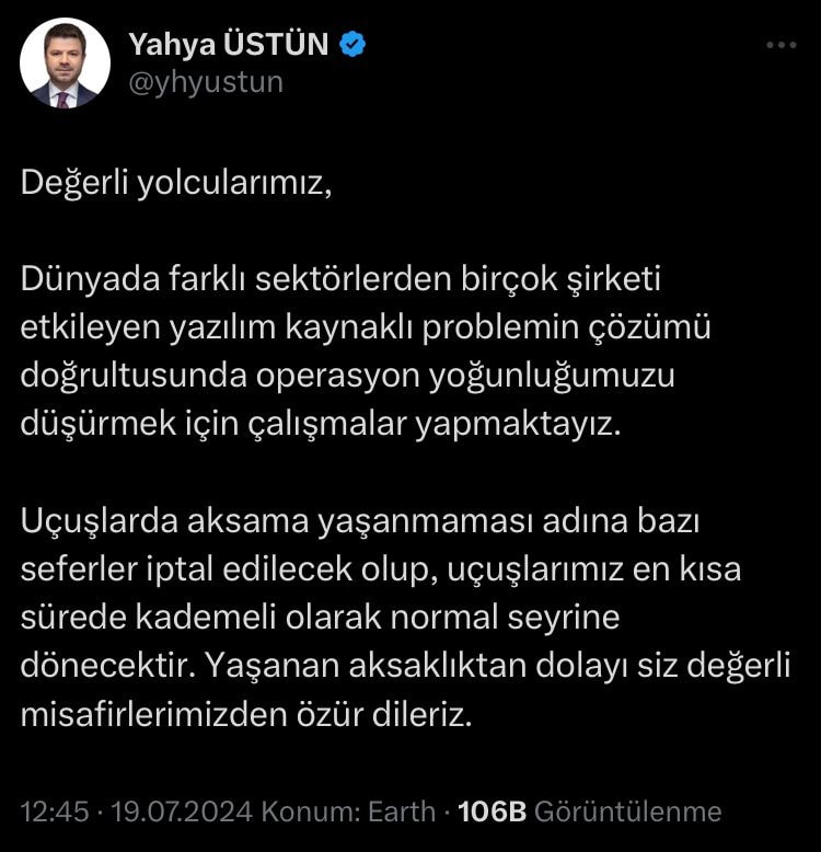 X hesabı üzerinden konuya ilişkin açıklama yapan THY Basın Müşaviri Yahya Üstün, “Dünyada farklı sektörlerden birçok şirketi etkileyen yazılım kaynaklı problemin çözümü doğrultusunda operasyon yoğunluğumuzu düşürmek için çalışmalar yapmaktayız.