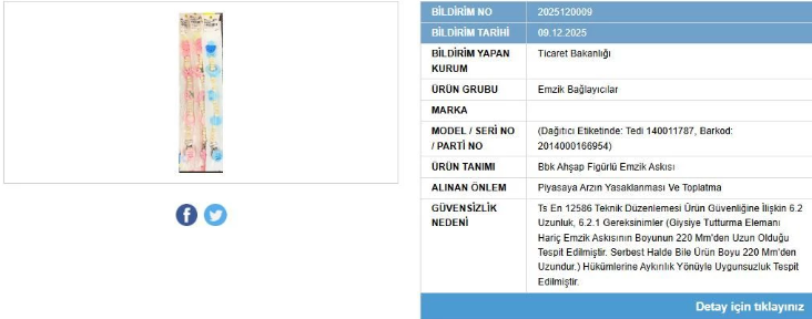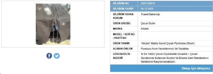 Güvensiz Ürün Bilgi Sistemi (GÜBİS) üzerinden yapılan duyuruda, bir çocuk pantolonu ile bir emzik askılığının sağlık açısından risk taşıdığı açıklandı. Denetimler kapsamında çocuk giyim ve bebek bakım ürünleri detaylı bir incelemeye tabi tutuldu. Yapılan değerlendirmelerde, her iki ürünün de güvenlik standartlarını karşılamadığı ve çocuk sağlığını tehdit eden bulgular içerdiği belirlendi.