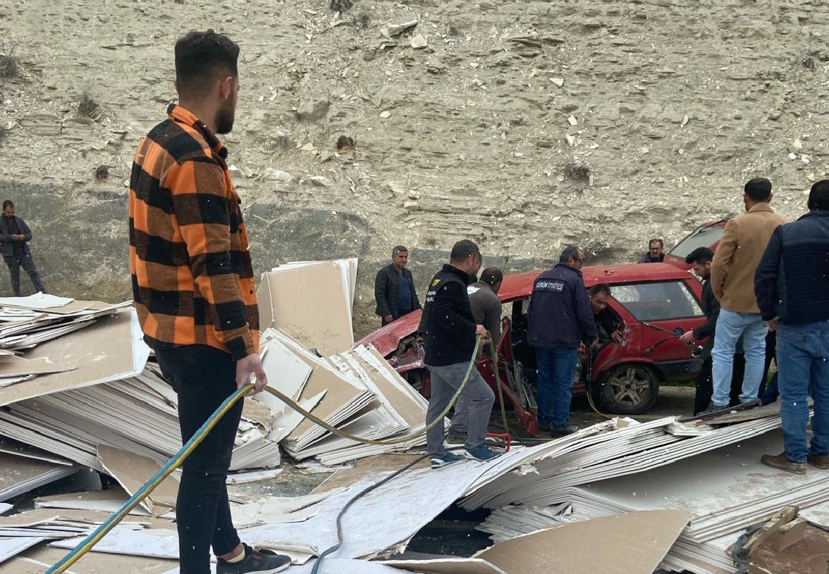 Sivas'ta gerçekleşen kaza, dün saat 11.00 sıralarında Gürün- Darende kara yolunun Çayboyu Mahallesi yakınlarında meydana geldi. Mehmet Adımlı yönetimindeki 50 ADF 035 plakalı alçıpan yüklü TIR, yağış nedeniyle kayganlaşan yolda devrildi. TIR'ın dorsesindeki alçıpan malzemeler karşı yönden gelen Çetin Karaşin yönetimindeki 01 LE 212 plakalı otomobilin üzerine devrildi.