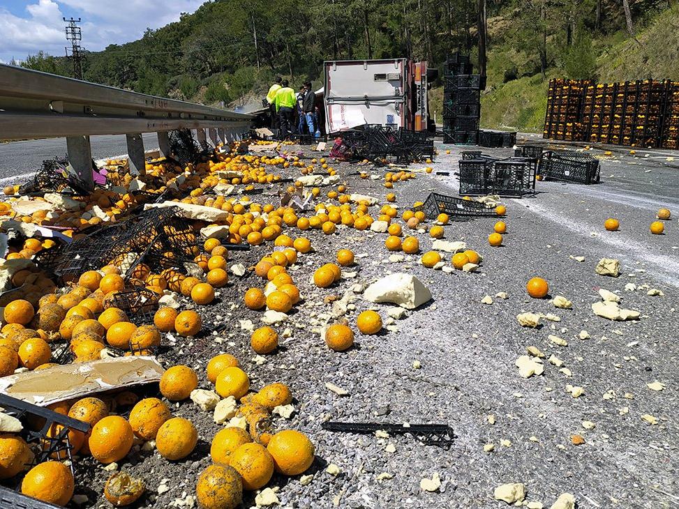 TIR'daki meyveler yola saçıldı. TIR'dan kendi imkanlarıyla çıkan sürücünün sağlık durumunun iyi olduğu öğrenildi.