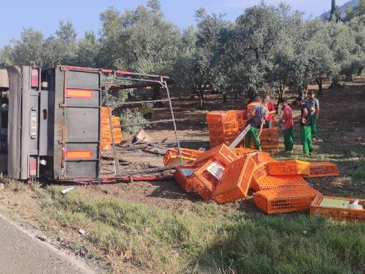 Kazada kafeslerdeki yüzlerce tavuk öldü. Tavuk ölüleri, başka TIR'a yüklenerek yoldan kaldırıldı. Kaza ile ilgili soruşturma başlatıldı. (DHA)