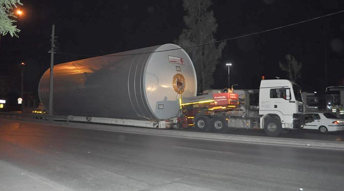 İzmir'de bir içki firmasının fabrikasına yaklaşık 20 metre uzunluğundaki mayalama deposunu taşıyan TIR, cadde üzerindeki elektrik tellerini kopartırken, sürücüler paniğe kapıldı.
