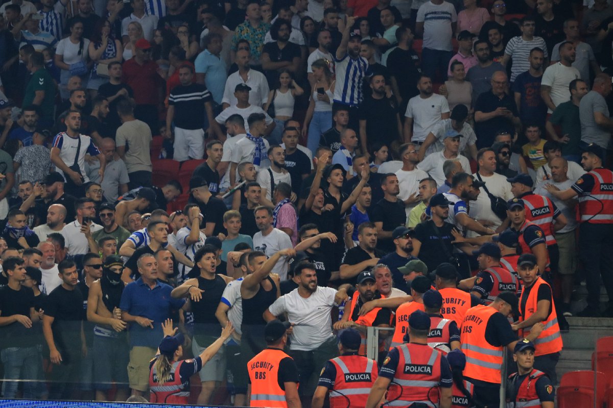 UEFA delegeleri kısa bir toplantı yaptıktan sonra statta bulunan Arnavut polisi de gerginliğin yaşandığı iki tribün arasında güvenlik koridoru sağlamaya çalıştı.