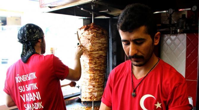 BOLU'da lokantacı Mahmut Alan, çalışanlarına 'Döner sattık, su sattık, vatanı satmadık' yazılı tişörtler giydirerek 15 Temmuz darbe girişimini protesto etti.