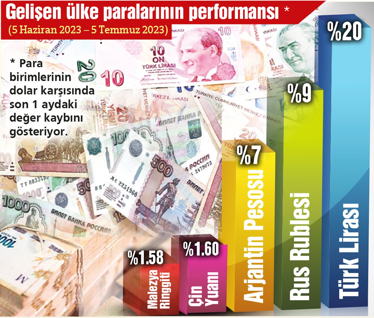23 ülkenin yer aldığı gelişmekte olan piyasalarda, TL dolara karşı son 1 aylık kaybı ile diğer para birimlerini açık ara solladı. Dolar karşısında TL’nin yüzde 20’lik kayıpla ilk sırada olduğu listede, Rus Rublesi yüzde 9’luk kayıpla ikinci oldu. Arjantin Pesosu’nda aylık değer kaybı ise yüzde 7’ye ulaştı. Bu üç ülkenin ardından gelen Çin Yuan’ı, Malezya Ringgiti ve Tayvan Doları’nın aylık kaybı ise yüzde 2’yi bulmadı. Türkiye’nin Hazine ve Maliye Bakanı Mehmet Şimşek liderliğindeki yeni ekonomi yönetimiyle düşük faiz politikasından en azından bir süre, uzaklaşması bekleniyor.
