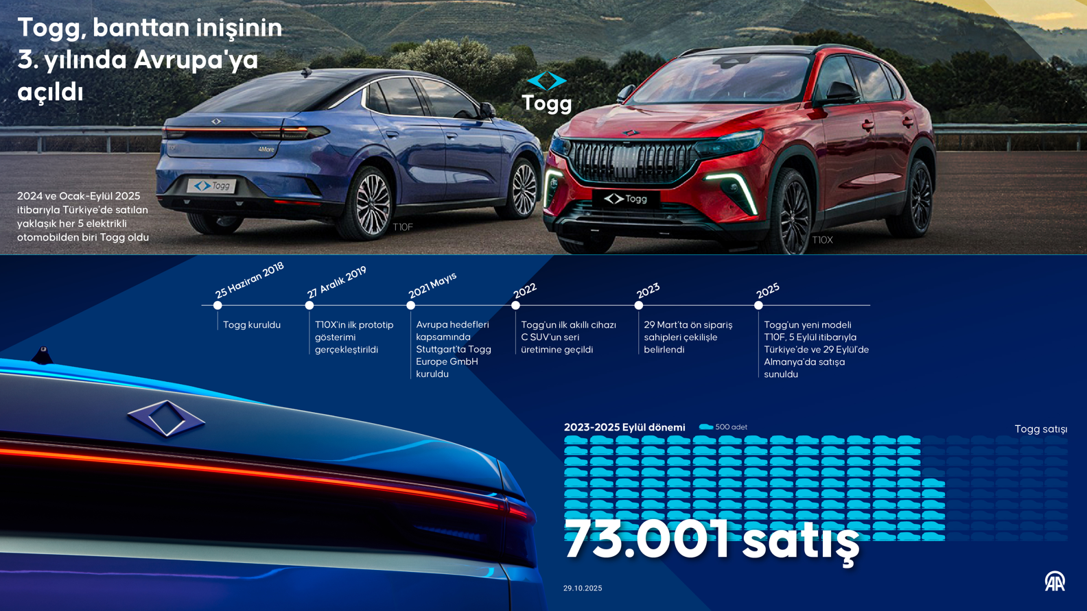 Türkiye'nin yerli ve milli otomobil hayalini gerçekleştiren Togg, 29 Ekim 2022 tarihinde ilk kez banttan inişinin 3. yılını kutlarken, Avrupa'da satışlarına başladı.
