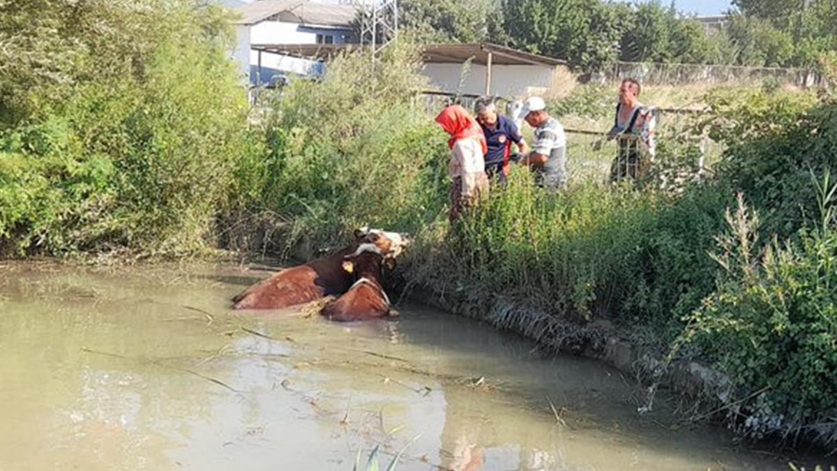 Tokat’ın Erbaa ilçesinde Kelkit Çayı kenarında otlayan büyükbaş hayvanlardan 3’ü, dengesini kaybederek yakındaki gölete düştü. Hayvanların sahibi Mustafa Yağcı, inekleri kendi çabasıyla sudan çıkaramayınca durumu 112 Acil Çağrı Merkezi’ne bildirdi.