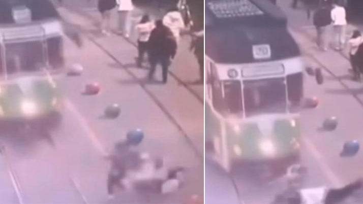 Görüntülerde tramvay yoluna giren torununu iterek kurtaran babaannenin tramvayın altında kaldığı görülüyor.