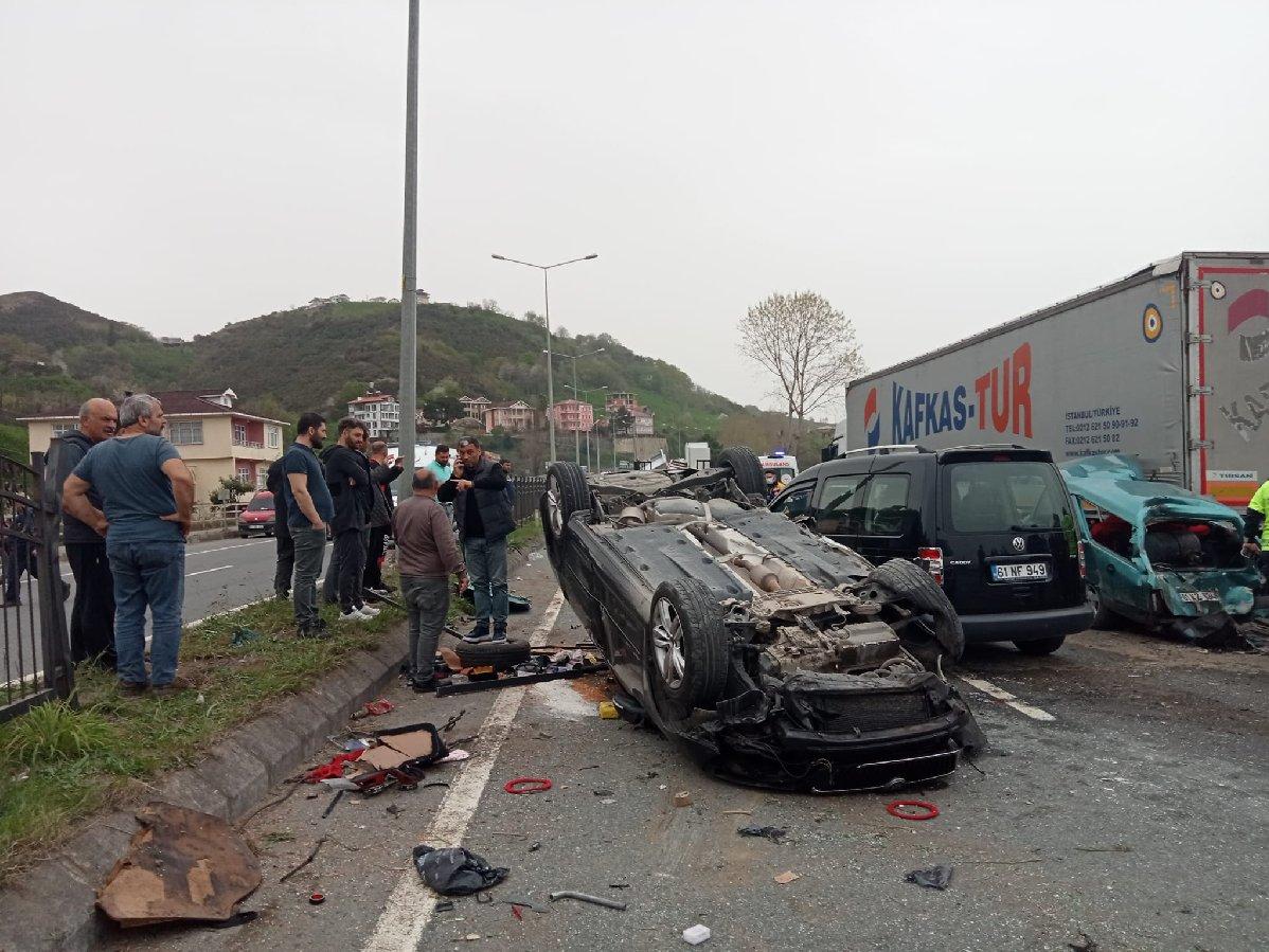Çarpışmanın etkisiyle savrularak karşı yöne geçen 2 otomobilden biri TIR altına girdi, diğeri de devrildi. Arkadan gelen başka bir otomobilin de çarpmasıyla 4 aracın karıştığı zincirleme kaza oluştu.