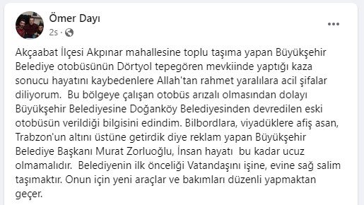 Bölgeye eski otobüs gönderildiğini ifade eden CHP Ortahisar Belediye Meclis üyesi Ömer Dayı, sosyal medya hesabından şu açıklamayı yaptı: “Akçaabat İlçesi Akpınar mahallesine toplu taşıma yapan Büyükşehir Belediye otobüsünün Dörtyol tepegören mevkiinde yaptığı kaza sonucu hayatını kaybedenlere Allah'tan rahmet yaralılara acil şifalar diliyorum. Bu bölgeye çalışan otobüs arızalı olmasından dolayı Büyükşehir Belediyesine Doğanköy Belediyesinden devredilen eski otobüsün verildiği bilgisini edindim. Bilbordlara, viyadüklere afiş asan, Trabzon'un altını üstüne getirdik diye reklam yapan Büyükşehir Belediye Başkanı Murat Zorluoğlu, İnsan hayatı bu kadar ucuz olmamalıdır. Belediyenin ilk önceliği Vatandaşını işine, evine sağ salim taşımaktır. Onun için yeni araçlar ve bakımları düzenli yapmaktan geçer”