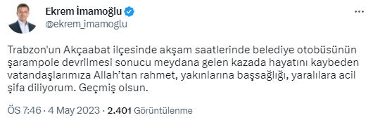 İstanbul Büyükşehir Belediye Başkanı ve Cumhurbaşkanı Yardımcısı adayı Ekrem İmamoğlu, Trabzon'da meydana gelen kazayla ilgili şu açıklamayı yaptı: