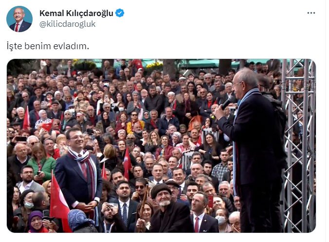 Trabzon ziyaretinden bir kareyi Twitter hesabından paylaşan Kemal Kılıçdaroğlu, İmamoğlu'nun yer aldığı kareye "İşte benim evladım" notunu düştü.