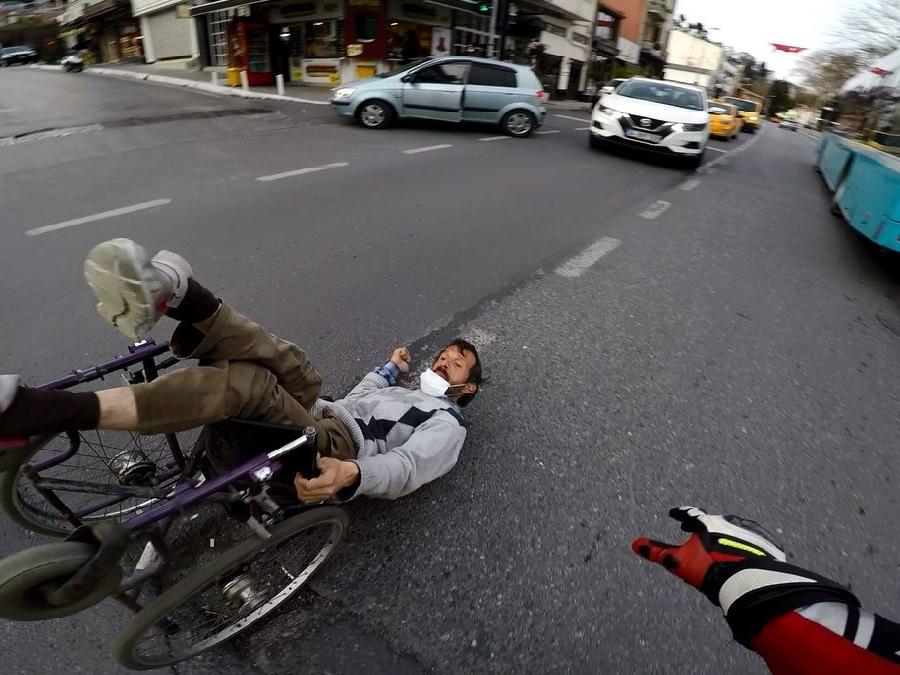 Motosikletin yol kenarına park eden Redkan, yardıma koştu. Engelli kişiyi yerden kaldıran Redkan, daha sonra motosikletine binerek yoluna devam etti. O anlar ise Redkan'ın kask kamerasına yansıdı.