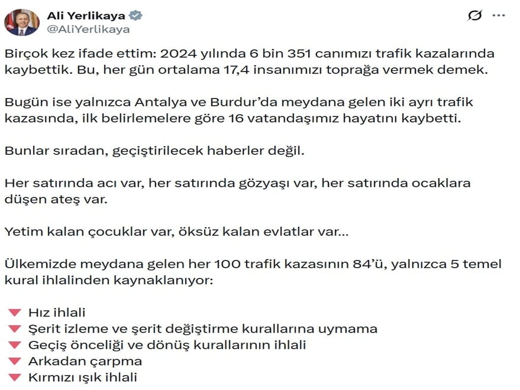 Bakan Yerlikaya, "Birçok kez ifade ettim; 2024 yılında 6 bin 351 canımızı trafik kazalarında kaybettik. Bu, her gün ortalama 17,4 insanımızı toprağa vermek demek. Bugün ise yalnızca Antalya ve Burdur'da meydana gelen iki ayrı trafik kazasında, ilk belirlemelere göre 16 vatandaşımız hayatını kaybetti. Bunlar sıradan, geçiştirilecek haberler değil. Her satırında acı var, her satırında gözyaşı var, her satırında ocaklara düşen ateş var. Yetim kalan çocuklar var, öksüz kalan evlatlar var. Ülkemizde meydana gelen her 100 trafik kazasının 84'ü, yalnızca 5 temel kural ihlalinden kaynaklanıyor; hız ihlali, şerit izleme ve şerit değiştirme kurallarına uymama, geçiş önceliği ve dönüş kurallarının ihlali, arkadan çarpma, kırmızı ışık ihlali" ifadelerini kullandı.